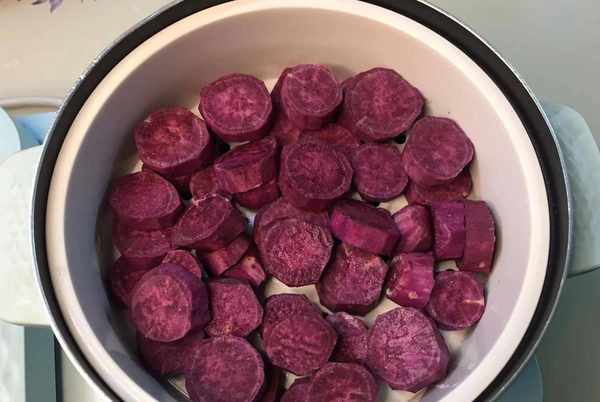 2.紫薯去皮后切成薄片,再放入蒸屉中,冷水上锅蒸15分钟。