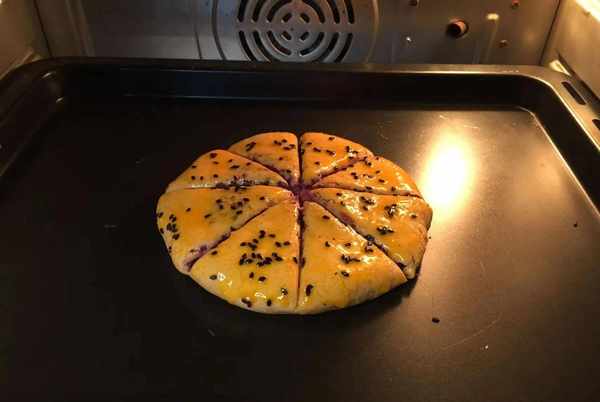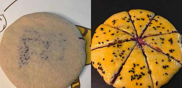 8.收口朝上,轻轻用擀面杖擀成大饼,翻个面后放入烤盘中,用刀分成8等份,最后再刷上蛋黄液撒上适量的黑芝麻。