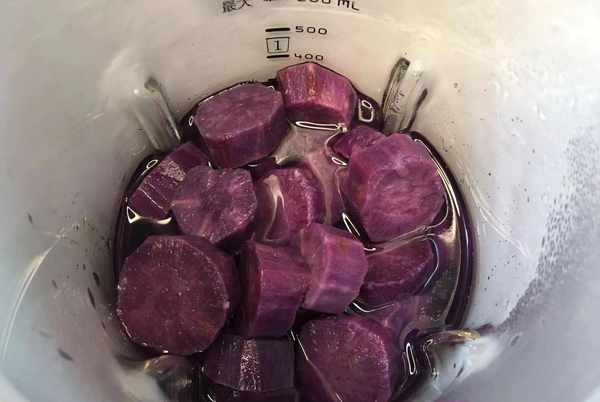 3. 把蒸熟的红薯倒入破壁机中,再加2ml的水,选择果汁功能搅打成紫薯泥,想要更细腻的可以多打一次。