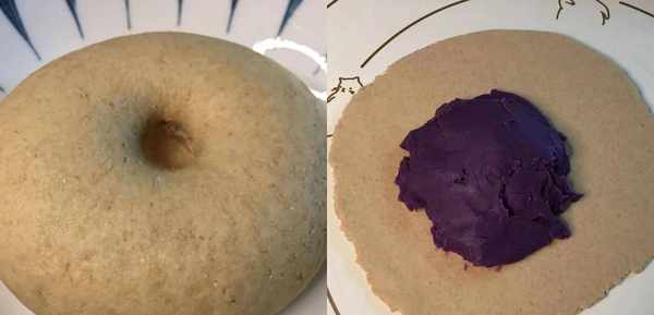 7.全麦面团已经醒发至两倍大,用手指在中间戳个洞不回缩不塌陷说明就醒发好了,把醒发好的面团放到硅胶垫上揉搓排气,再放上紫薯馅,然后像包包子一样包起来。