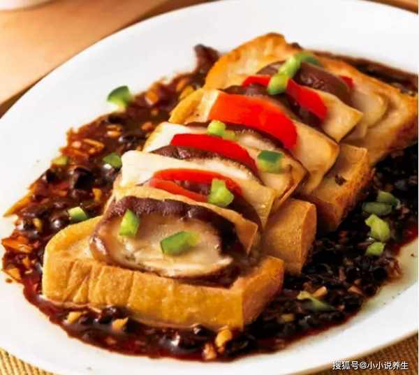 3.将豆腐放入盘中,然后放入红辣椒片和蘑菇片。