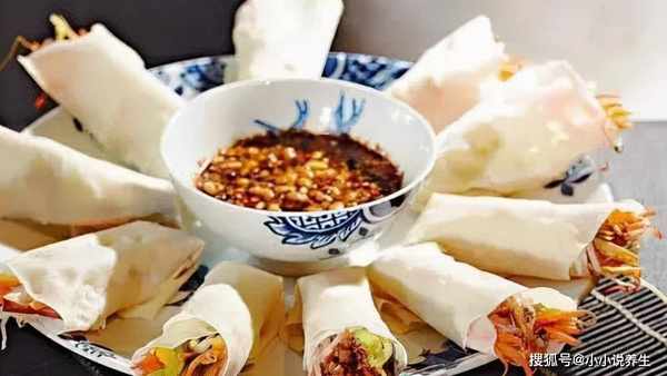 做法:1、面粉加水,加少许盐揉匀(水:面粉比例为1:6),平底锅烧热,抹油,晾干,然后用左手拿起面团,搓成圆状在锅底轻敲,形成一个直径为9厘米的薄圆皮时,立即用右手提起,这样做几十张春卷皮,放入蒸一会儿使它们变软,使它们更容易包裹。有的家庭还用电熨斗做煎饼,把面团放在熨斗底下就可以做成薄片。