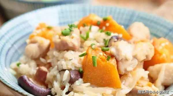 第四步,将米洗净,放入电饭锅中,倒入炒好的南瓜、香菇和鸡块,加两勺生抽和两勺盐,倒入水没过米饭,煮熟比平常少一点,盖上盖子,按下烹饪按钮,煮30到40分钟。