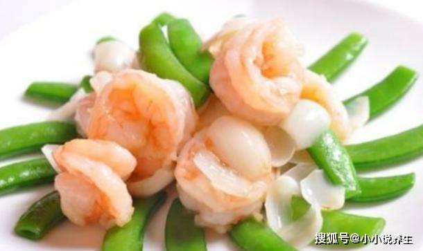 材料:鲜虾、百合、荷兰豆。葱、盐、胡椒粉、糖、料酒、酱油。