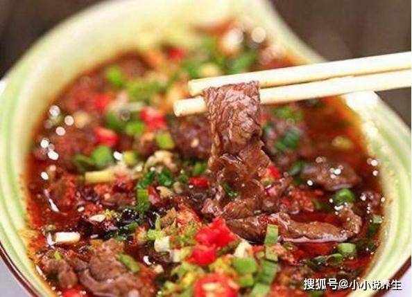 5、将牛肉取出放在沙拉上,盖上汤,撒上切碎的青蒜、香葱、小米椒圈、蒜末、花椒面、辣椒面,最后倒入热油提香。
