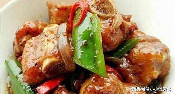 3、锅里热油再放洋葱,把青红椒炒到表面微黄,再把排骨炒几遍,转小火。加入黑胡椒酱爆香,加盐和鸡汤调好口味即可裹上。