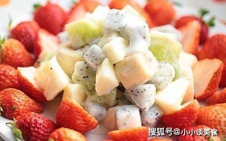 7.将混合好的水果放在盘子里,放在周围的草莓中间。与草莓上的酸奶一起食用。