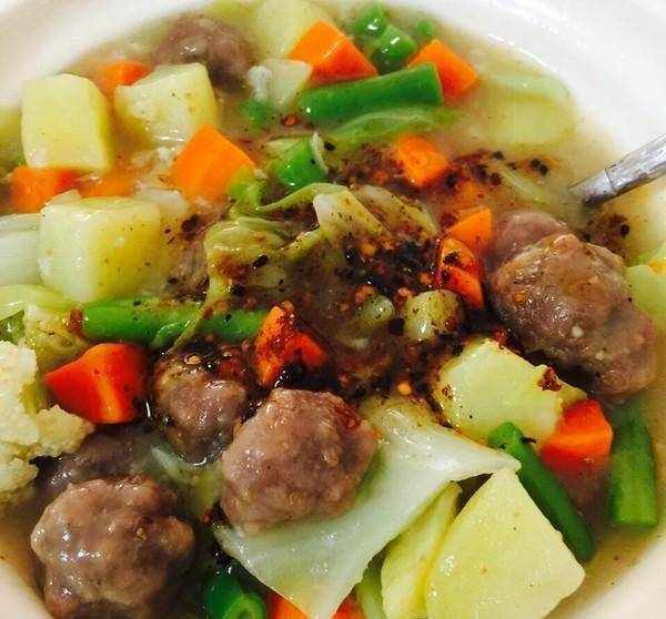 6.锅中放入骨头汤,加盐;放入小丸子煮至熟;消除;7、在煮丸子的汤里放入辣椒粉、花椒粉和少许热油。根据蔬菜的熟度加入豆类和马铃薯,煮至差不多熟透。加入胡萝卜煮至基本熟;加入卷心菜,煮半分钟。;