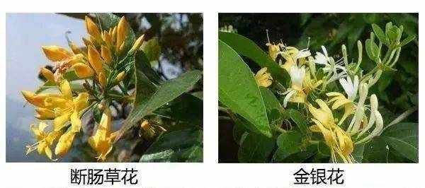 而金银花的花蕾一开始是白色、盛开后变成黄色,叶面毛茸茸的、没有光泽。