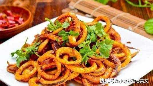 材料:鱿鱼、甜面酱、葱花、姜、香菜粉、盐、糖、料酒、油