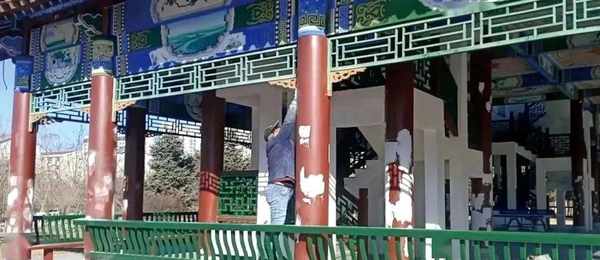 3月16日上午,在草原丝绸之路文化公园,施工人员正在维护凉亭柱子。记者看到,凉亭柱子由于长时间风吹日晒,棕红色的外漆逐渐开裂、脱落,变得斑驳,影响了凉亭的整体美观,也加大了保洁人员的工作量。据介绍,为了让凉亭恢复到往日的面貌,施工人员要对掉漆部位打磨后重新刷漆。