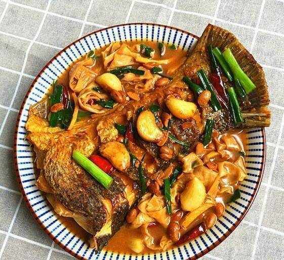 材料:金鱼尾一条,卤豆腐一块(相对于石膏豆腐),大蒜,生姜,酱油,白糖,胡椒粉,孜然粉,猪板油(猪白脂熬成的油,勾芡后呈白色),花生/豌豆/玉米淀粉