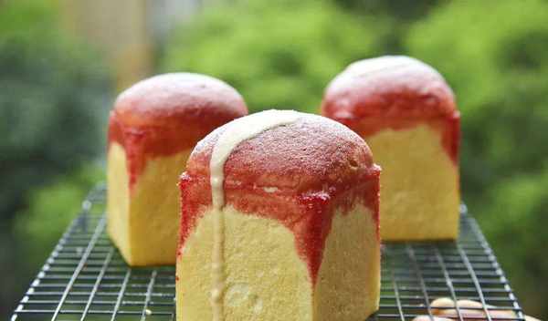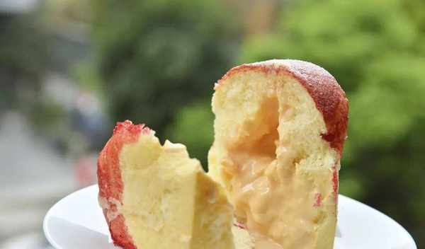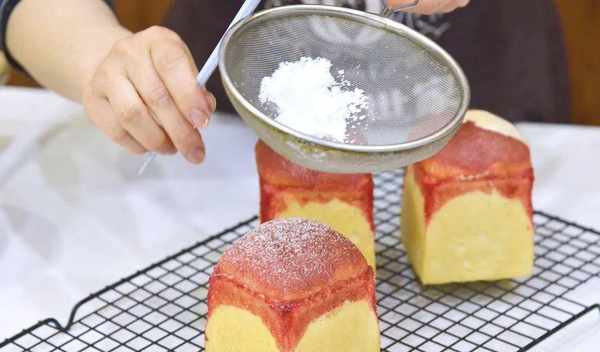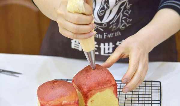 12.烘烤完成,取出面包稍微晾凉之后,将白桃爆浆馅挤在面包中间,最后可以再筛少许糖粉装饰一下,颜值超级高气质著名棒的白桃爆浆面包就完成了;