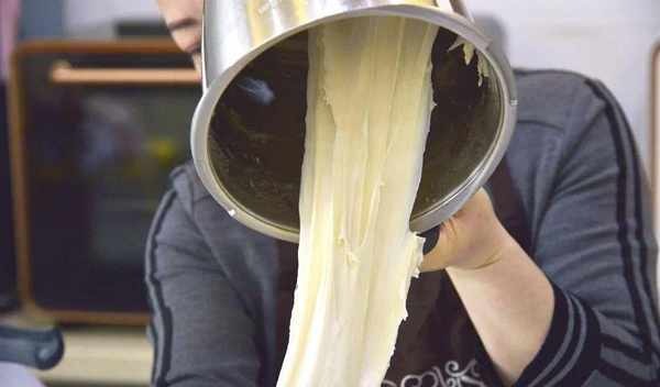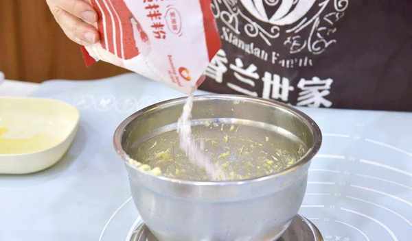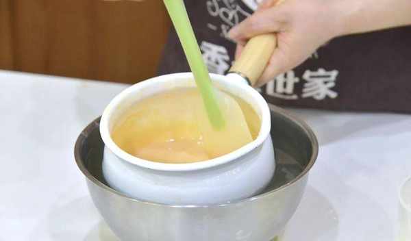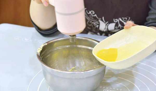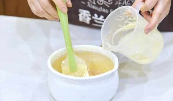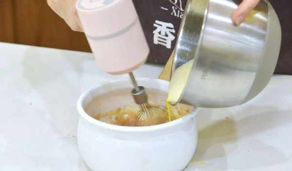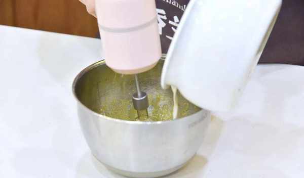8.醒发过程中制作白桃爆浆馅,牛奶倒入不粘锅中小火煮至85℃,蛋黄中加入0卡糖,用电动打蛋器搅打至细腻发白,将煮至微沸的牛奶缓慢倒入蛋黄糊中,一边倒一边用电动打蛋器搅打均匀;