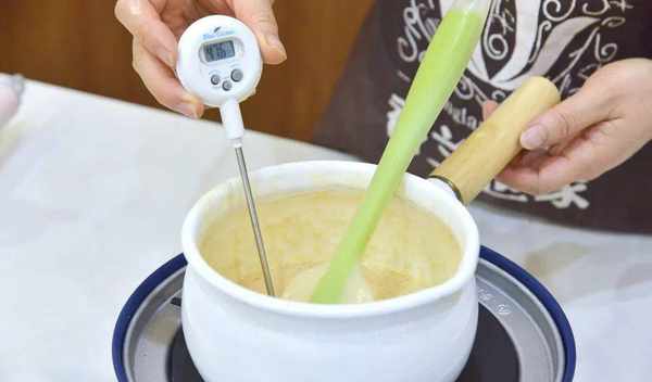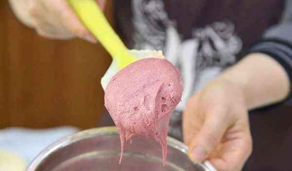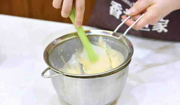 9.之后将白桃豆沙馅搅打均匀松散,将蛋黄牛奶分3次加入到白桃豆沙中,搅打均匀无颗粒后过筛一遍,再倒回不粘锅中,继续小火加热至65℃;(如果是无菌蛋可以省略回锅煮的步骤)