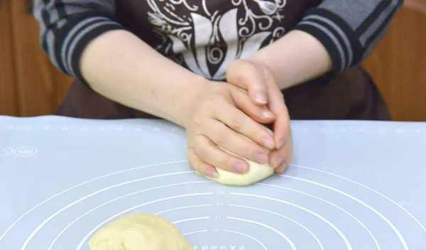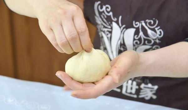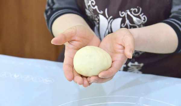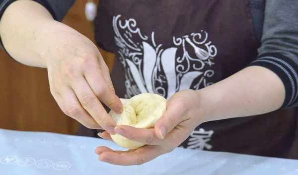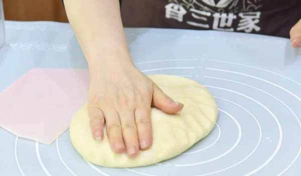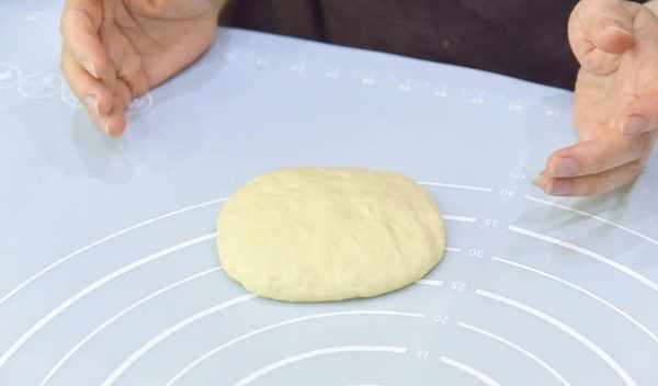 6.松弛完成,用手将面团拍打为中间厚边缘稍薄的扁圆,之后将扁圆收拢捏紧包圆;