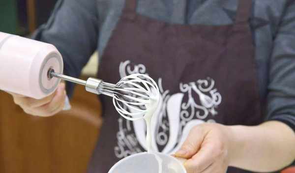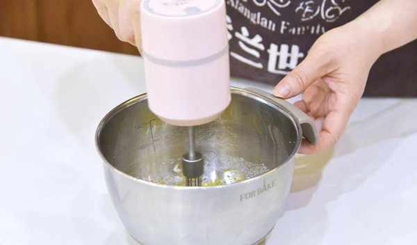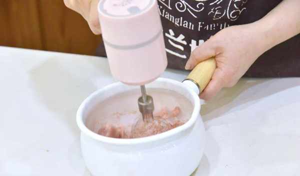 10.淡奶油用电动打蛋器搅打至稳定有纹路半流动的状态,豆沙牛奶隔冷水降温,再将打发后的淡奶油分2-3次加入到降温后的豆沙牛奶中,与淡奶油混合均匀之后,白桃爆浆馅就做好了;