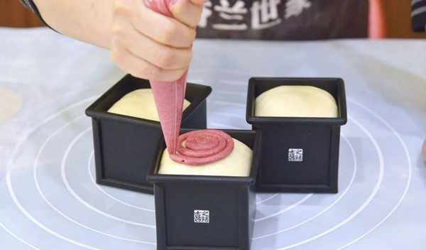 11.面团醒发到与吐司盒平齐时,将墨西哥酥皮装入裱花袋中,以画圈的方式均匀挤在面团表面,放入预热好的烤箱中,上火160℃下火180℃,烘烤时间25分钟左右;(烘烤时间温度仅供参考,具体根据烤箱温和成品上不法况调整)