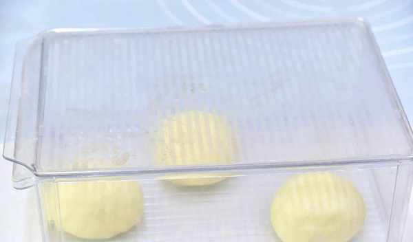 3.再用揉面模式揉4分钟,然后放入黄油,继续揉3分钟,取出揉好的面团收圆放入醒发盒中,现在的温度可以直接放室温醒发40-60分钟;(揉好的面团如果温度较高,可以隔冰袋进行降温)