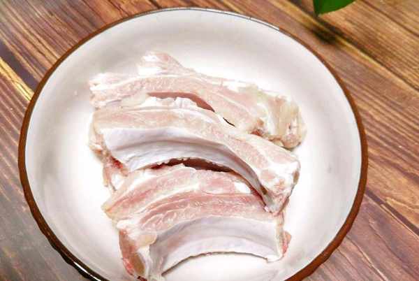 1、选购一斤新鲜的猪肋排,排骨买回来后清洗干净,然后放在冷水中浸泡30分钟,尽量把排骨中的血水浸泡出来,然后用手搓洗几遍,再用厨房纸擦拭干水分即可。