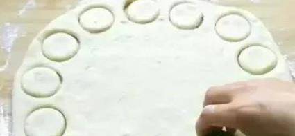然后把面团放在案板上揉匀,这样可以更好的排出面团中的空气。如果怕粘手,我们也可以在面团上撒一些干面粉。面团揉好后,我们就可以把面团擀成薄饼,再擀的时候能感觉到厚度在0.5厘米左右。然后在面团上盖一层保鲜膜进行二次发酵。二次发酵完成后,我们准备一个稍微大一点的瓶盖压在面团上,这样就可以压出很多泡芙了。如果家里有其他模具,也可以用其他模具做一些小蛋糕。其余的面团可以一起揉,继续这样做,直到所有的面团都这样揉好。