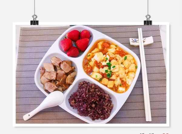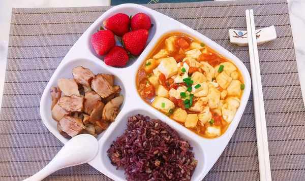 午餐:番茄豆腐、红烧肉、杂粮饭、草莓。