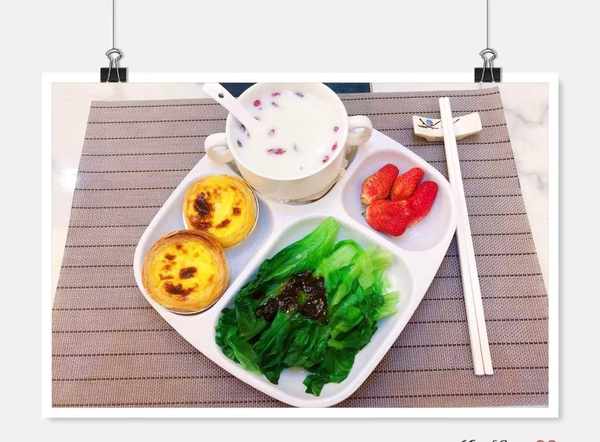 早餐:鸡蛋饼、牛奶麦片、水煮白菜心、草莓。