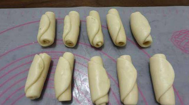 17、用擀面杖擀成长条,然后从下面往上卷。