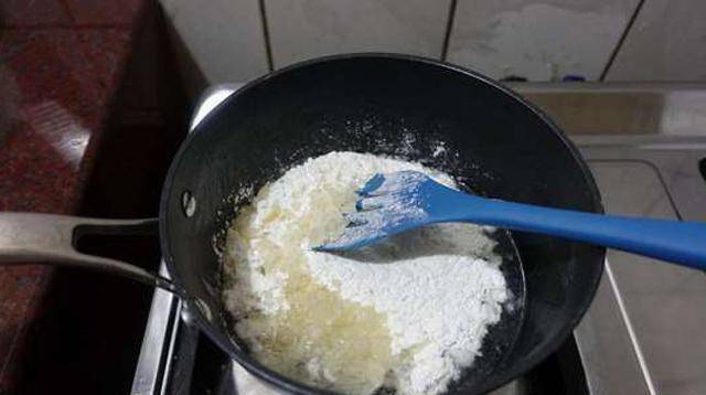 2.将糯米粉放入锅中,炒至熟。火不需要太高。我用中小火(接近小火)炒2-3分钟左右。你可以闻到香气。面粉摸起来很烫。
