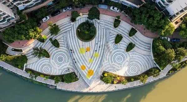 轴线广场,旧年今时。旧时的老码头、圆形广场、大白伞等标志性建筑,承载着无数两湾人的旧年回忆。今时的一河两湾以此为轴不断延伸,颇具线性之美的镂空栈道更为广场增添现代美感。