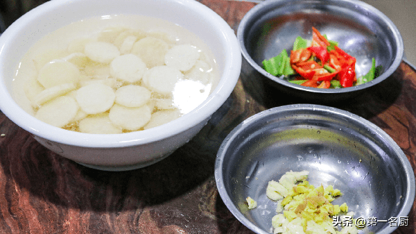 1.准备淮山药两段,洗净后削皮,切成薄片,放入水盆中,加入白醋避免山药变黑,青椒一个切成菱形片,红椒半个切成片,大蒜几粒拍扁,生姜一小块切成姜粒备用。