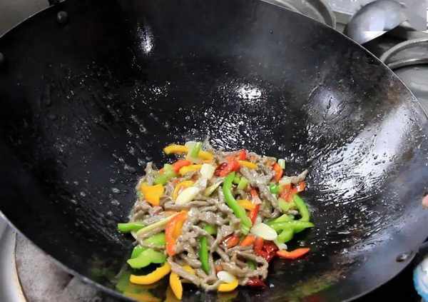 6.放入牛肉丝和彩椒丝继续翻炒,翻炒均匀以后淋入少许芝麻香油,淋入香油可以使牛肉更加鲜亮和美味,翻匀后,即可出锅装盘。