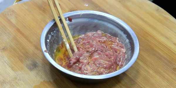 2.下面,我们把牛肉丝腌一下:在牛肉丝中放入料酒5克,食盐2克,胡椒粉2克,白糖2克,用筷子搅拌均匀,放入少量的清水,让牛肉吸收水分,味道更为滑嫩,打入一个鸡蛋清,蛋清遇热凝固,能够保持水分。