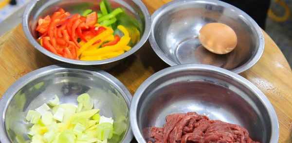 1.首先我们准备一下食材:牛肉一块,先片成薄片,再切成牛肉丝,放在盆中,青椒、黄椒、红椒各一片都切成丝,主要用来配色。大蒜切成蒜片,生姜切成姜片,大葱破开,切成葱粒。