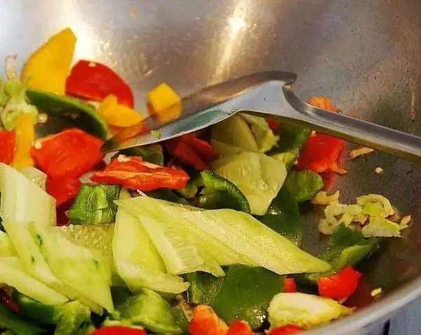 另起油锅,爆香五香粉和葱花,下入彩椒和黄瓜片,翻炒。少许淋点水让彩椒更滑嫩,颜色更艳丽,口感更爽脆。不用勾芡汁。