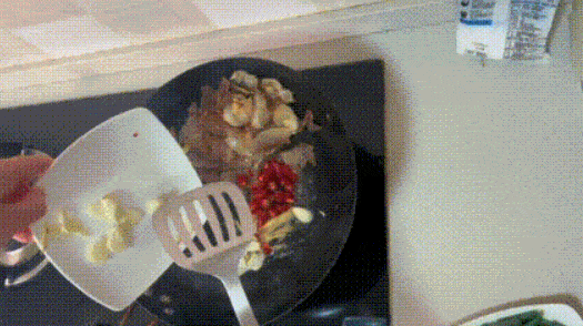 4.再将蒜片、姜丝、辣椒、花椒一同下锅翻炒。