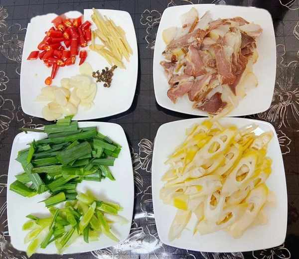 2.蒜叶、红辣椒切段,蒜切片,姜切丝。腊肉切片,焯水去咸味后捞出备用。