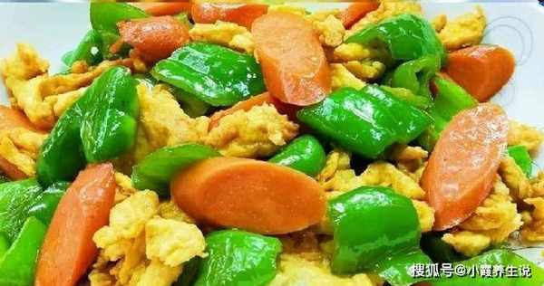 3另一锅热油,爆香青椒。炒至生,加入火腿片,加鸡蛋,根据需要加生抽,盐和鸡精根据需要,炒匀出模。