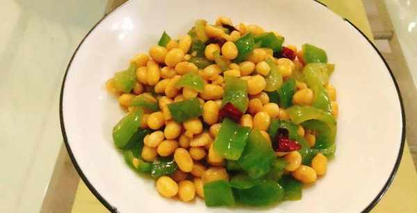 3.锅预热加油,加入小米辣炒出辣味,加入葱姜炒香,然后加入黄豆煸炒一会儿,加入青椒继续翻炒几下,然后加入蚝油、少量生抽,胡椒粉和盐,调色调味,翻炒均匀,装盘出锅。