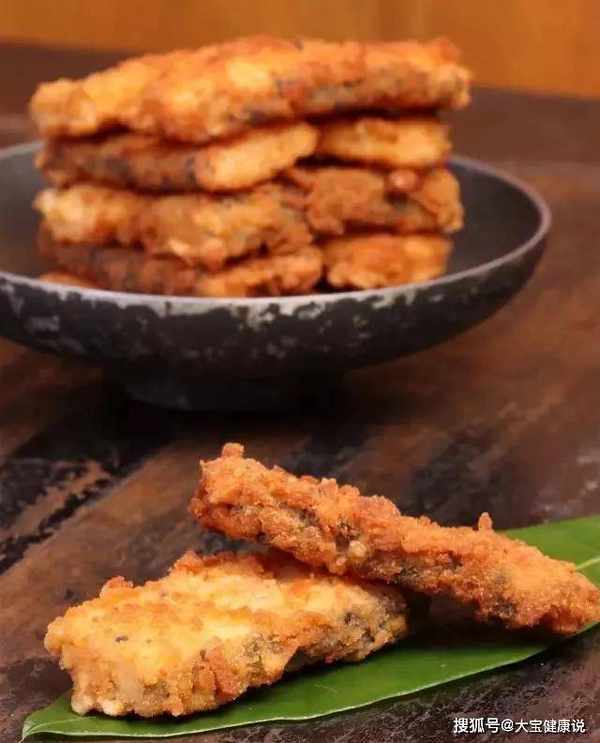 4、取15片蒸鱼糕,放入鸡蛋粉糊(150克豌豆淀粉,3个鸡蛋打成浓糊)擀平,两面均匀抹上一层面包屑。加入60%的热油炸至金黄酥脆,捞出沥干油装盘。