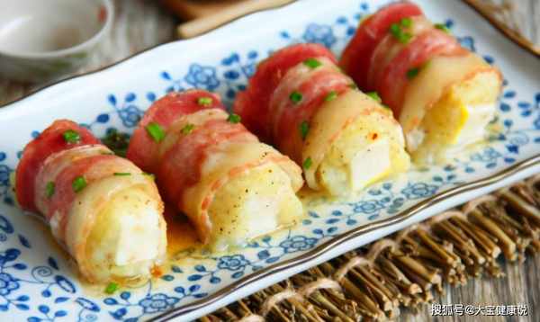 2.把土豆泥裹在培根里。土豆很粘。相对于其他的食材,你不需要用牙签来固定它们。如果喜欢口味重一点的,可以在培根表面抹上少许酱汁,放入烤箱200度烤15-20分钟左右。培根会稍微烧焦并卷曲。准备烘烤。