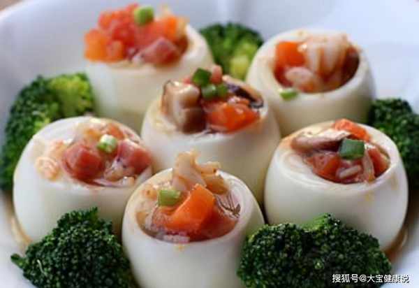 材料:鸡蛋6个、胡萝卜、金针菇、香菇、墨鱼、火腿、西红柿、西兰花