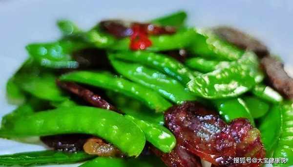 3、放香肠,香肠炸成透明状,放上炸豌豆软的一面。
