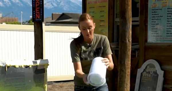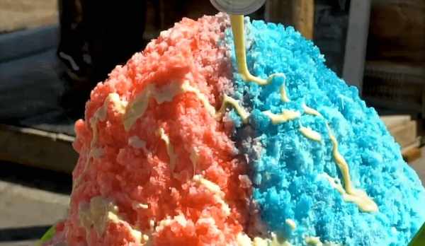 小伙用机器将冰块打成冰沙,接着再将这些冰沙都装进塑料桶里,除此之外,还在冰沙中间挖出一个洞并往里面放入一个奶块。随后继续往塑料桶里装入冰沙,甚至还将冰沙垒的非常高。在制作的过程中,他们往这些冰沙上面,挤入了大量的色素饮料,在最后还撒上了一些果酱和芝士。
