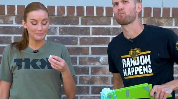 视频中我们可以看到老外和自己的女友正准备自制冰激凌,因为他们俩都非常喜欢吃冰淇淋,于是决定制作一个巨无霸冰淇淋,他们首先准备了塑料桶,泡沫板还有干冰,将泡沫板干冰都放入塑料桶里进行降温,接着开始准备冰沙。