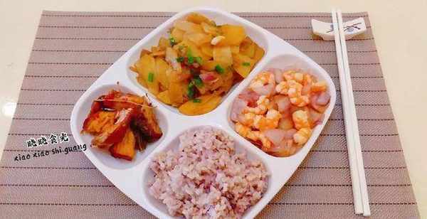 虾仁炒洋葱、炒冬瓜、腊鱼、三色糙米。