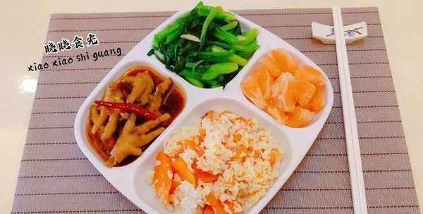 红烧凤爪、清炒白菜心、地瓜饭、金柚。
