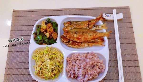 香煎海鱼、青椒炒鸡腿、炒黄豆芽、三色糙米。