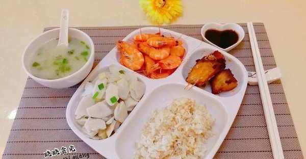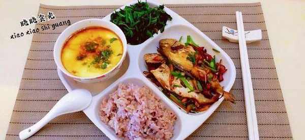 蒸鸡蛋、自制海鱼、白灼桑叶芽、三色糙米。