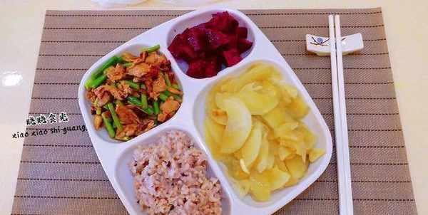 蒜苔炒肉片、炒雪莲果、三色糙米、火龙果。